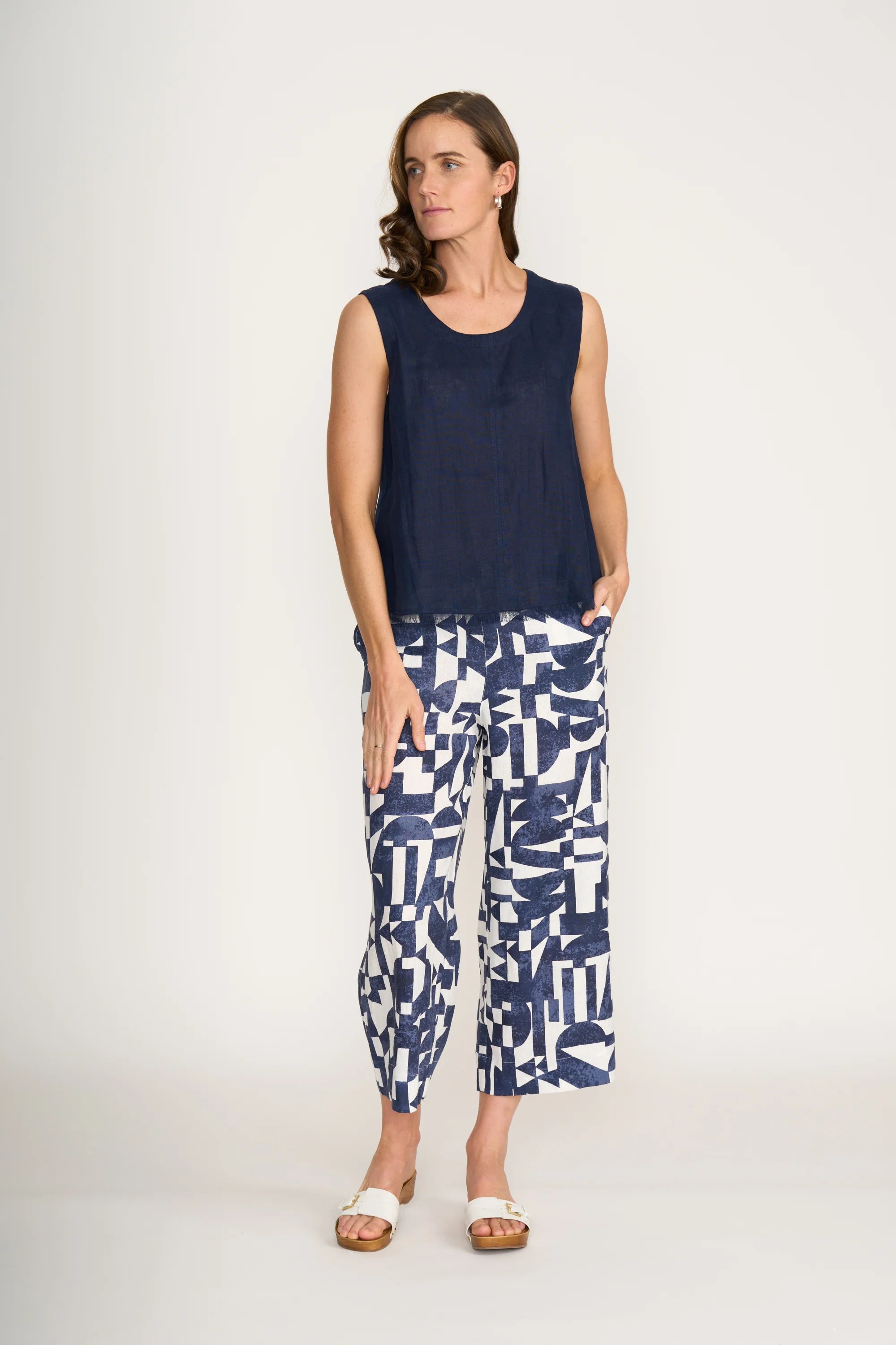 A warm-weather essential with an easy, flattering drape. The Benefits Shell Top is cut from breathable 100% linen with a soft scoop neckline, small fringe detailing on hemline and bra-friendly shoulders. The relaxed A-line shape skims—not clings—finishing with a gently curved hem that layers effortlessly over skirts, pants and shorts.
